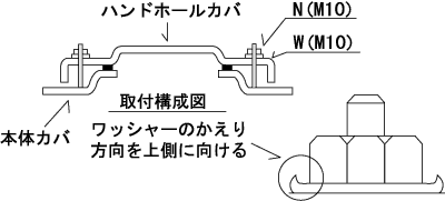 ハンドホールカバを本体カバの正規位置にセットし、ワッシャーを介して手で軽くナットを締め付ける。