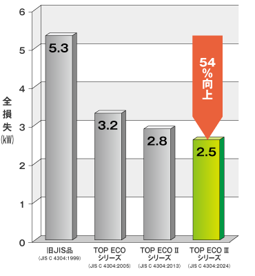 鉄心に低損失磁性材料であるハイグレードな珪素鋼板を全面採用し、コイル導体は、導体断面積を増加するなど、従来の低損失変圧器からさらに無負荷損、負荷損を低減させ、低損失化を実現しました。