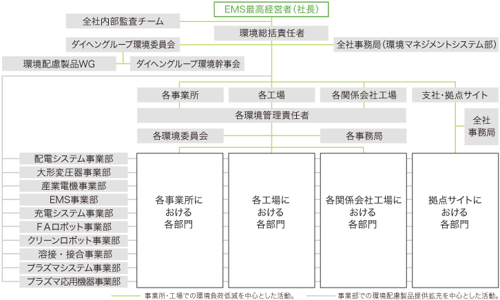 当社社長を「EMS※1最高経営者」、環境担当役員を「環境総括責任者」とする実行体制を敷くとともに、環境方針の審議・決定と具体的な活動計画の策定を行う「ダイヘングループ環境委員会」を設置し、環境保全活動の強化を図っています。具体的な活動としては、「環境配慮製品WG※2」「ダイヘングループ環境幹事会※3」によるグループ横断的な連携を図りながら、各事業所・工場と各事業部が、「事業活動に伴う環境保全」と「環境配慮製品・サービスの企画・開発」の両面に取り組んでいます。